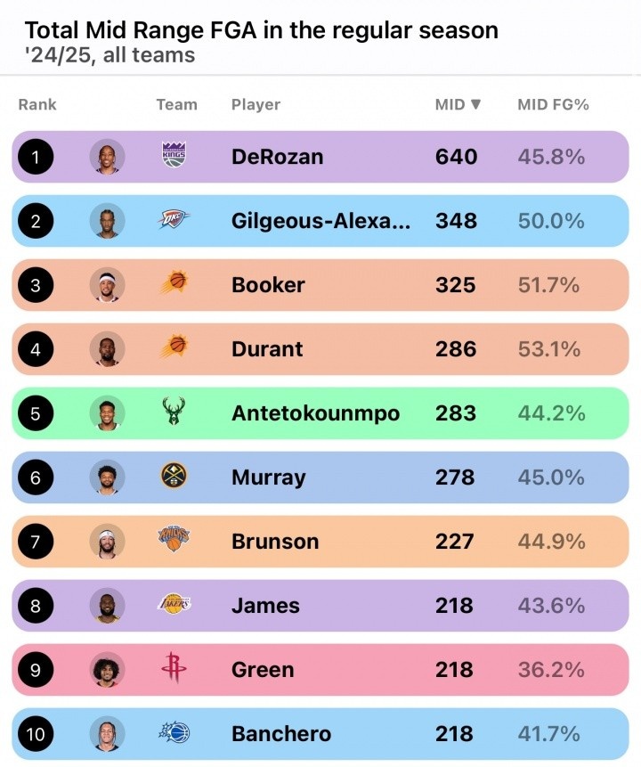 美媒则晒出了上赛季中投数量排名前十,德罗赞断层领跑,单赛季命中640记中投,命中率45.8%,排名第二的是亚历山大的348记,命中率50.0%,布克第三(325、51.7%),之后是杜兰特、字母哥、穆雷、布伦森、詹姆斯、杰伦-格林和班凯罗。
